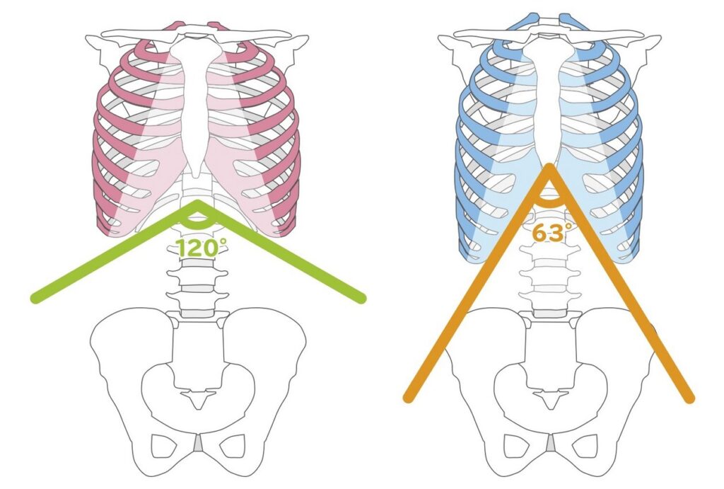 実際に、10代〜20代前半では肋骨下角(肋下角)は理想的な60〜65度ほどに保たれていますが、30代・40代と年齢が進むにつれて徐々に広がり、80代には120度に達するケースもあります。